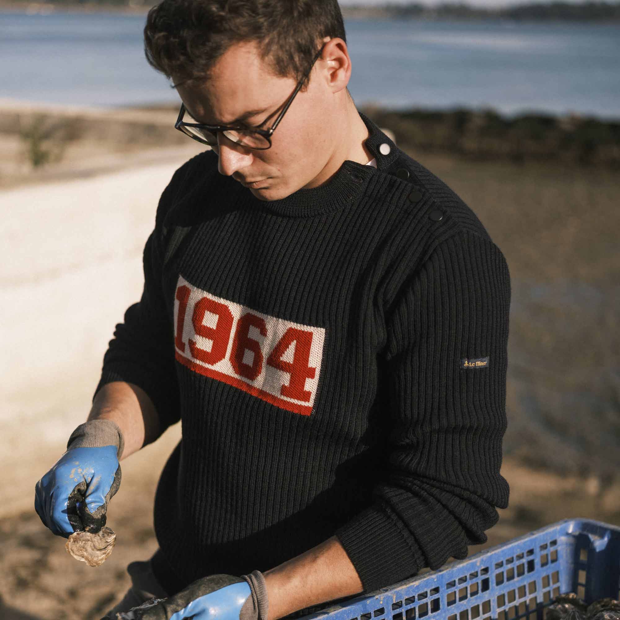 The 1964 sweater with its English rib, its collar and its button placket is a variation of our new "Newport" sweater, which brings back to the catalog our historical model of navy sweater with rib. This version of the navy sweater "with text" is a tribute to our century-old knitting know-how.