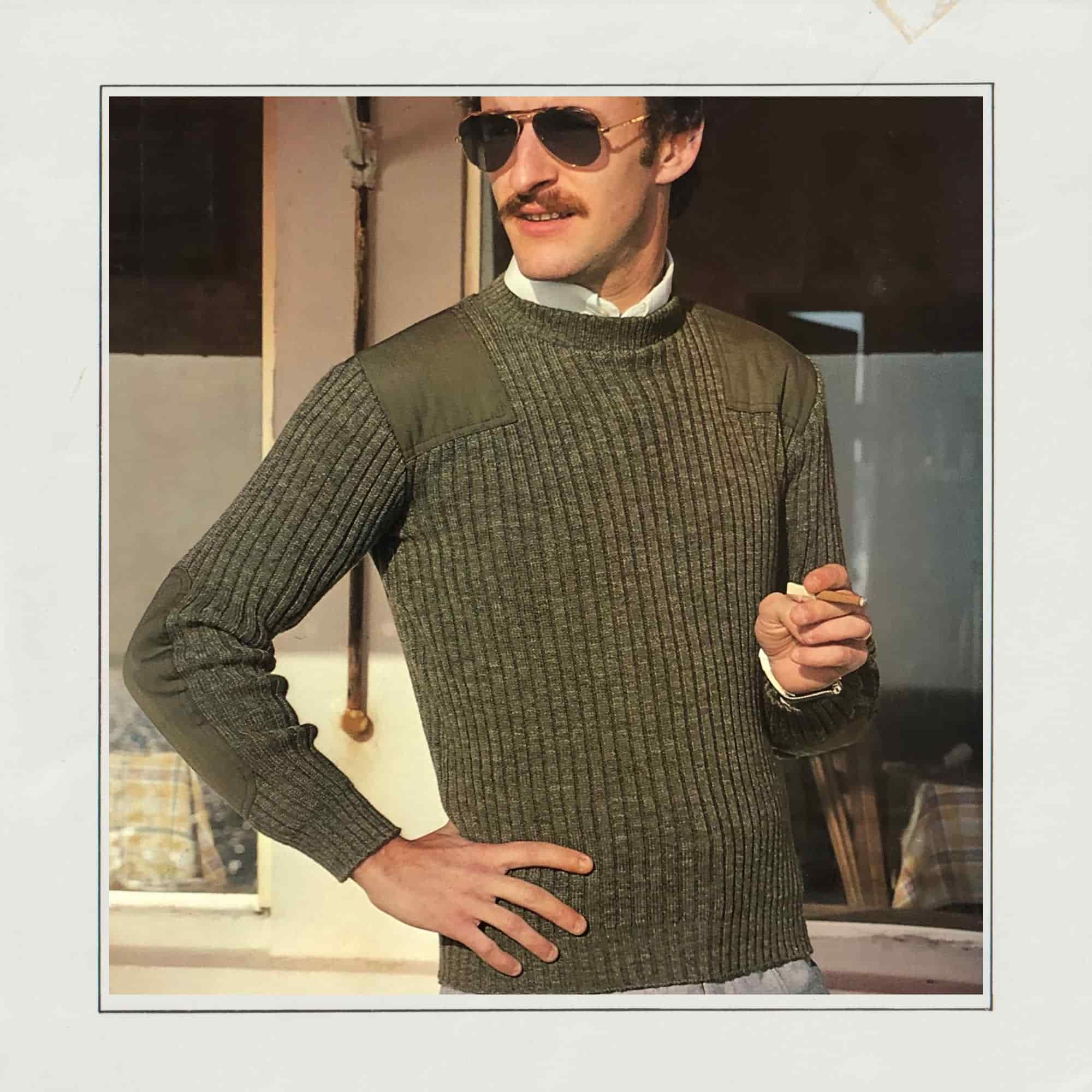 Pull décolleté V kaki, bords-côtes au niveau des manches et du bas. Date de fabrication : 1982. Marque MBL.