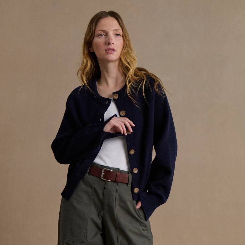 Disponible dans différents coloris, ce gilet mi-saison est tricoté dans une laine mérinos extra douce, composée d’une fibre fine et légère, tricotée dans nos authentiques ateliers de Guidel, parfaite pour les soirs d’été. Les manches ouvertes, grâce aux fentes délicates, offrent du confort et de l’élégance, de même que la surpiqûre aux épaules, qui souligne les têtes de manche, apportent de la féminité au look final du vêtement, qui s’adapte donc à tous les styles.