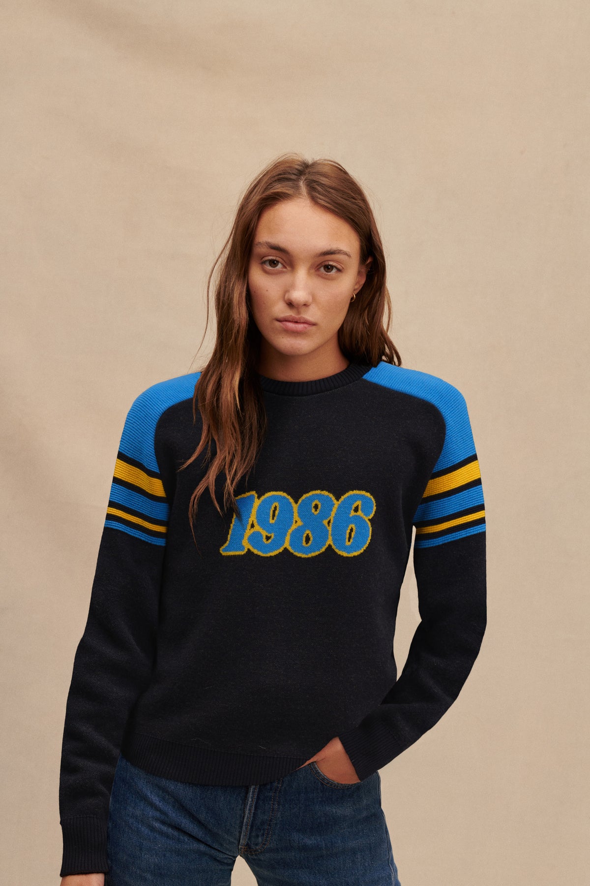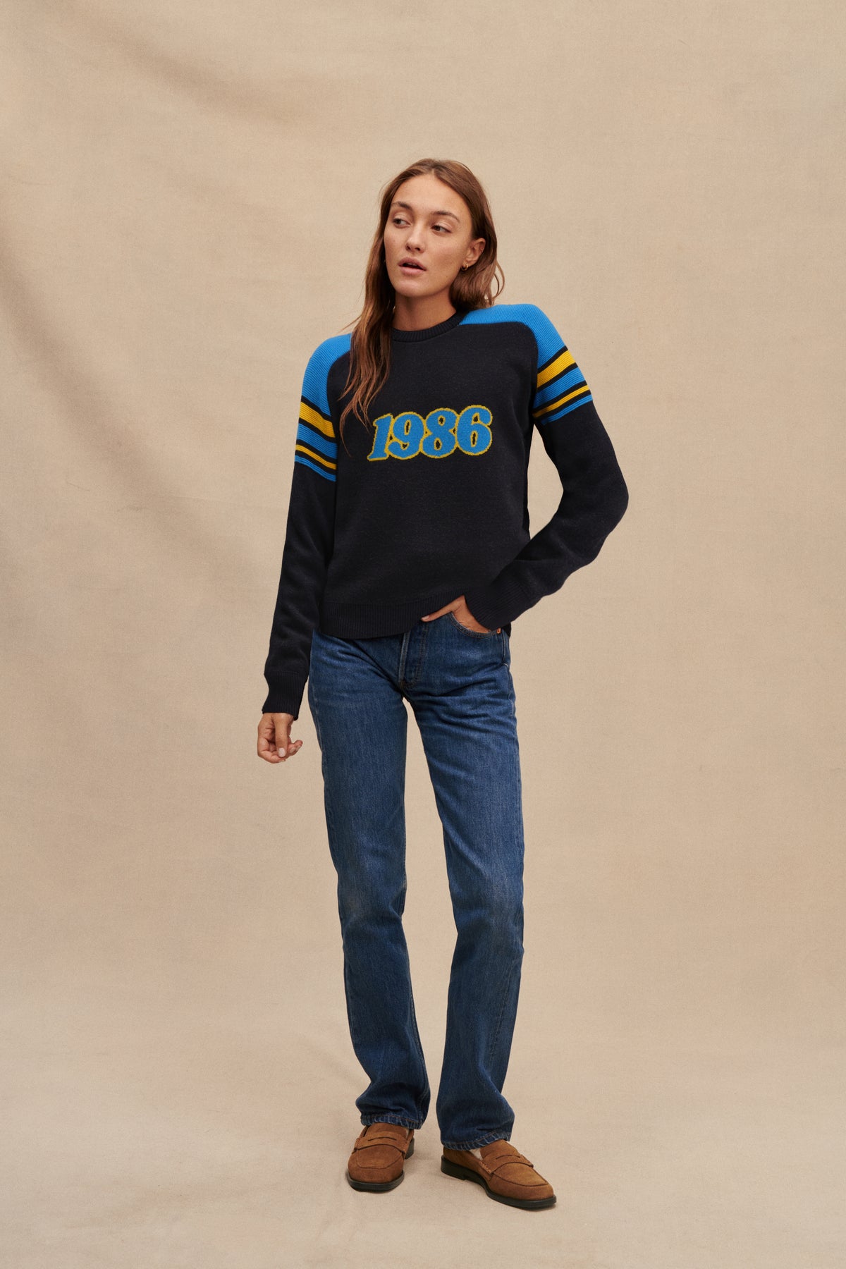 Confectionné en laine mérinos, ce pull se distingue par un mélange de couleurs audacieux : une base bleu marine profonde, rehaussée de touches bleu de France et de rayures jaunes sur les manches et les épaules. Le chiffre « 1986 », tricoté au centre du torse, joue sur ces contrastes dans un design net et graphique, capturant l'énergie vibrante de cette époque.